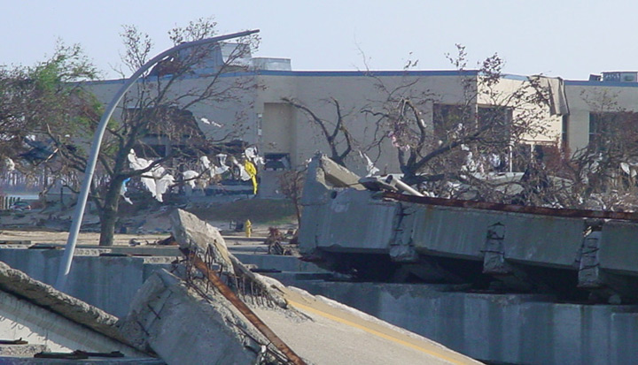 The foot of the destroyed Biloxi-Ocean Springs bridge overlooking the remains of the J.L. Scott Marine Education Center